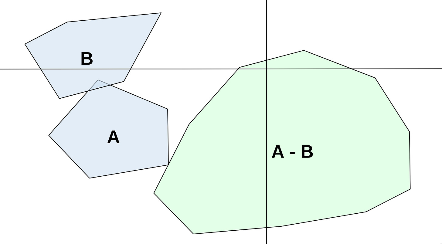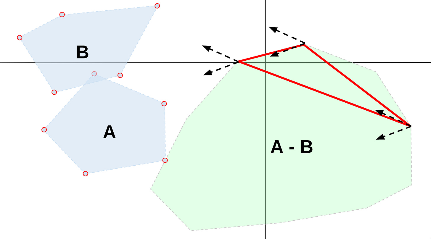 Remember how I previously said we'd need to find 3 points on A, and 3 points on B? Well, we really only need to find 3 points in total. That's because of the following useful property of the Minkowski difference: