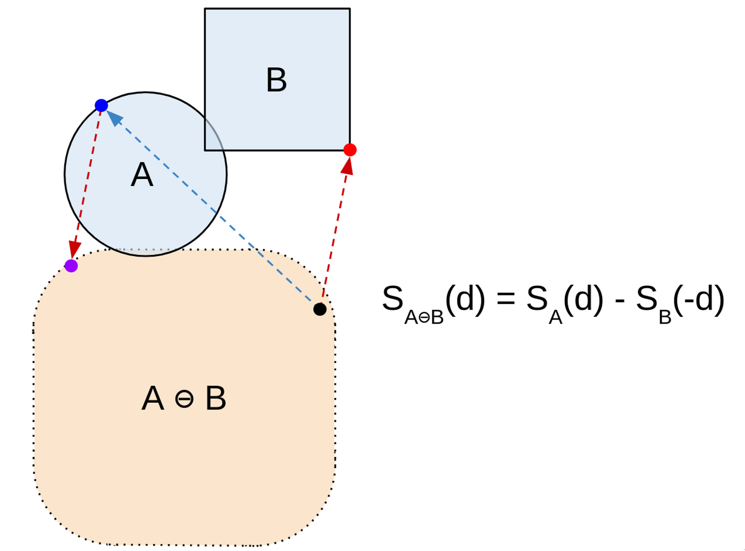 Put differently, most combinations of points on A and B don't matter, as they won't land us on the border of A ⊖ B. We only need to consider the case where they're in opposite directions. (There's some easy intuition for why this is the case: I'll leave that as an exercise)
