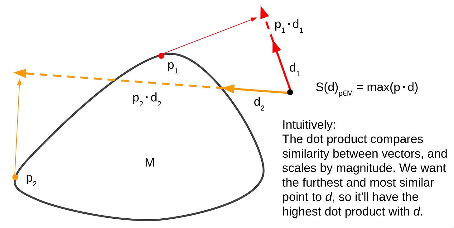 Things would be much easier if we had some system to identify points on our shape. The support function (denoted S here) does just that. It takes in a vector, and outputs the furthest point on the shape in that direction. On a convex shape, every boundary point is identifiable using the support function of some direction.